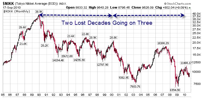 La bolsa nipona lleva dos décadas a la baja y va camino de la tercera. La intervención monetaria ha garantizado una larga depresión en Japón. Ahora, parece que EEUU sigue sus pasos.