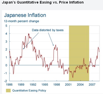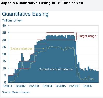 Desde el 19 de marzo de 2001 hasta el 9 de marzo de 2006, el BOJ inyectó miles de millones de dólares en la compra de activos y en los balances de los bancos. Las tensiones deflacionarias remitieron, curiosamente, en 2006, cuando finalizó el programa, para regresar poco después.