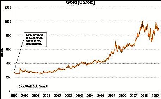 Entre 1999 y 2002, Brown ordenó vender 395 toneladas de oro de las 715 que en total poseía el Banco de Inglaterra -más de la mitad de las reservas-, justo cuando su precio marcaba su valor mínimo en 20 años. Desde entonces, el precio del metal amarillo se ha multiplicado por cuatro y, en la actualidad, cotiza cerca de los 1.100 dólares por onza.