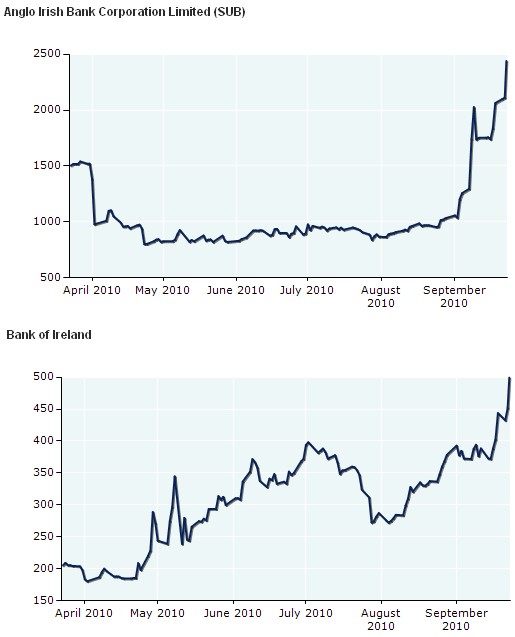 El diario Irish Examiner alertó que Dublín barajaba no devolver todo el dinero a los principales prestamistas (bancos) del nacionalizado Anglo Irish Bank. El rumor ha provocado en la sesión de este jueves un aumento sustancial en las primas de riesgo de la deuda irlandesa que, por extensión, ha afectado a las economías más débiles de la zona euro (ver gráficos).