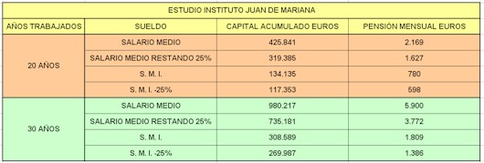 Las conclusiones a las que llegaron no pueden ser más demoledoras para el sistema público en vigor. Un trabajador medio que hubiera entrado al mercado laboral con 25 años en 1992 podría jubilarse en 2012 con una pensión de, aproximadamente, 2.169 euros. Y quitando ese 25% de fondo común (un porcentaje mayor del que seguramente sería necesario), aún le quedarían 1.627 euros al mes.