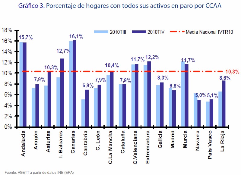 La región con un mayor porcentaje de hogares en esta circunstancia es Canarias, por quinto trimestre consecutivo, que sitúa su tasa en 16,1%. Andalucía, Asturias, Baleares, C. La Mancha, C. Valenciana, Extremadura y Murcia son las comunidades que presentan un porcentaje de hogares con todos sus miembros activos en paro superior al del conjunto nacional. En el otro extremo se sitúa Navarra y País Vasco, con sólo un 5% y 5,1%, respectivamente, de hogares con todos sus activos en paro.