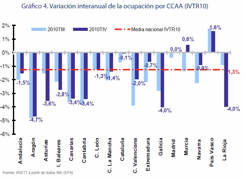Por si fuera poco, once de las diecisiete CCAA han destruido empleo a ritmos interanuales superiores al del conjunto nacional en el último trimestre de 2010 (-1,3%; -237.700 puestos): Andalucía, Aragón, Asturias, Baleares, Canarias, Cantabria, C. León, C. La Mancha, C. Valenciana, Galicia y La Rioja.