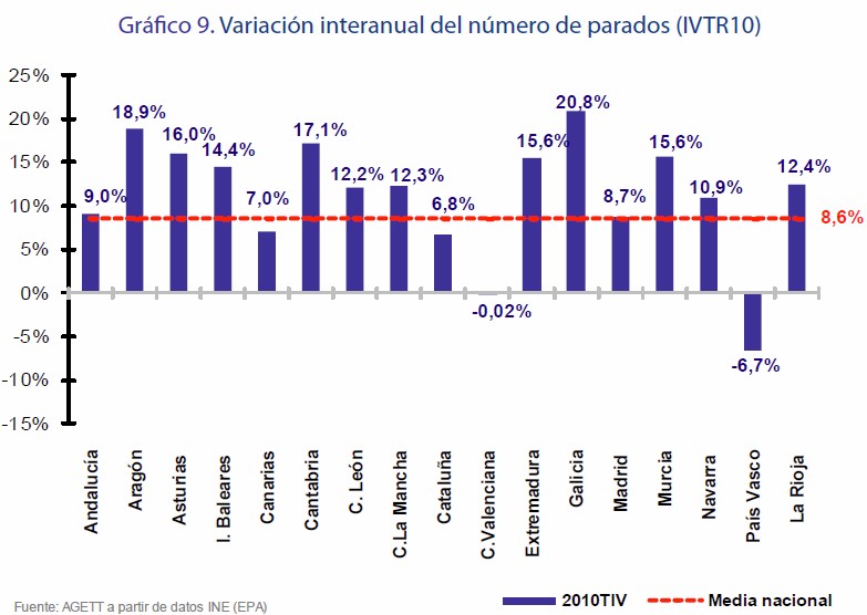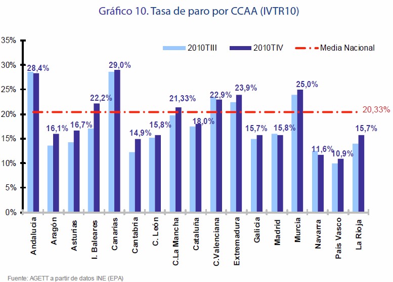 España cerró 2010 con un total de 4.696.600 parados, lo que equivale a una tasa del 20,3%. Desde que comenzó la crisis el número de personas sin trabajo se ha disparado en 2,9 millones de personas, 370.100 sólo en el último año (un 8,6% interanual, el menor aumento desde el cuarto trimestre de 2007). Sin embargo, el drama del desempleo varía en función de las regiones, y no sólo en número sino también en intensidad, tal y como refleja el último informe regional sobre el mercado de trabajo elaborado por Agett (Asociación de Grandes Empresas de Trabajo temporal).