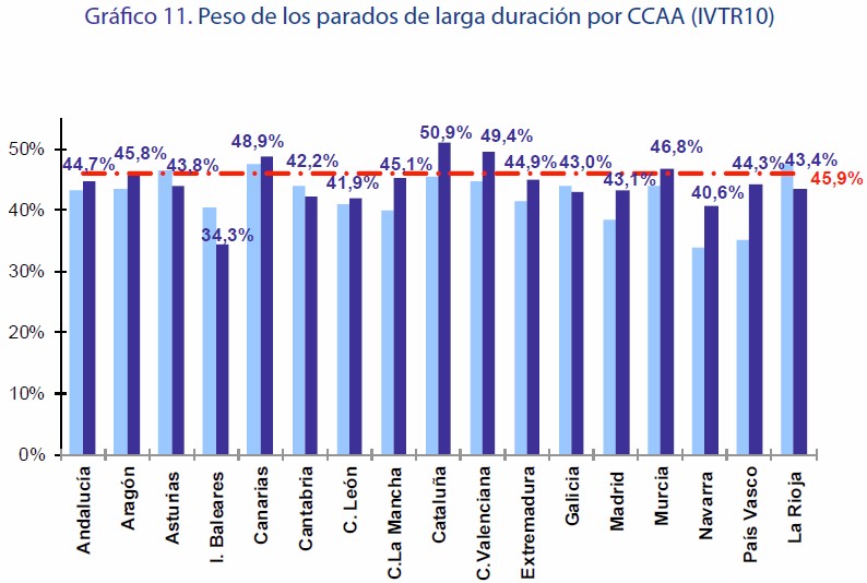 Por CCAA, Cataluña lidera el ranking, ya que más de la mitad de los desempleados llevan más de un año buscando sin éxito un empleo (50,9%). Le siguen C. Valenciana (49,4%), Canarias (48,9%) y Murcia (46,8%). Por el contrario, Baleares (34,3%) es la única región cuyo porcentaje de parados de larga duración se sitúa por debajo del 40%, seguida de Navarra (40,6%) y Castilla León (41,9%).