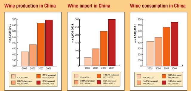 Si bien el consumo mundial de los caldos cayó un 3,6% interanual en 2009, el gigante asiático espera convertirse en el octavo país con mayor consumo de vino en el mundo a finales de 2011. Según datos de la Organización Internacional de la Viña y del Vino (OIV), el consumo mundial en 2008 se situó en los 245,2 millones de hectolitros.