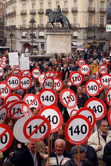 La Plataforma Movimiento 140 celebró este domingo en la Puerta del Sol de Madrid una concentración ciudadana contra el nuevo límite de 110 kilómetros/hora de velocidad máxima en autovías y autopistas, aprobado por el Gobierno dentro del paquete de medidas para reducir el consumo energético.