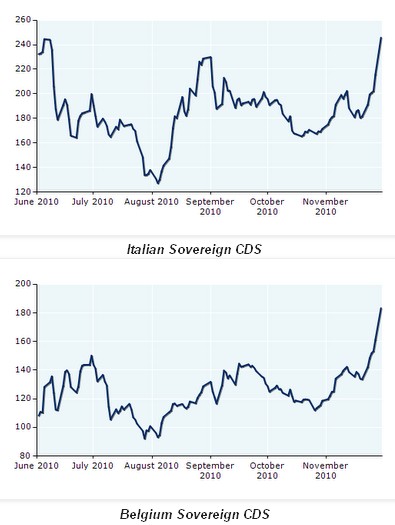 La tensión que vive la deuda pública de estos dos países se refleja en el mercado de credit default swaps (CDS), un seguro para cubrir inversiones en caso de impago (default). Así, los CDS de Italia y Bélgica (datos de CMA Vision) han aumentado de forma sustancial en las últimas semanas, tras las dificultades y posterior rescate de Irlanda.
