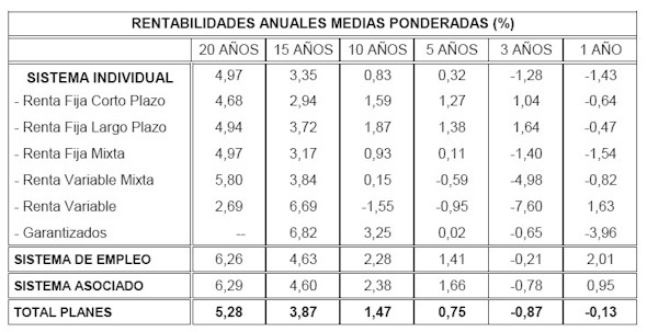 Rentabilidad de los planes de pensiones (Fuente: Inverco)