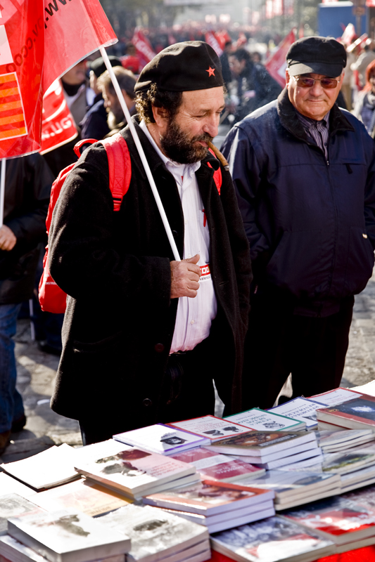 La generación más joven, la que se incorporó al manifestódromo nacional cuando lo de la Guerra de Irak es de consigna simple pero segura, combinan en perfecta armonía el puño en alto y la Internacional con el Zara y la Visa Electrón. Busco en la calle de Alcalá, junto a unos valencianos que han montado una mascletá improvisada al lado de un andamio, alguien de cierta edad, de lo que, hayan trabajado al menos una vez en su vida. Esteban viene de Extremadura, ronda la cincuentena, tiene la cara partida por la intemperie y un Ducados abrochado en los labios que se diría que vino de serie cuando su madre le trajo al mundo, me dice que “los patronos aprovechan ahora esto de la crisis para echarnos. No están jodiendo pero vamos a joderles nosotros a ellos”. Poca teoría, mucha práctica, Esteban es de Comisiones de toda la vida y sabe lo que se trae entre manos, por de pronto ir al bar con dos compañeros para endilgarse un carajillo matinal, que en Madrid hace mucho frío.