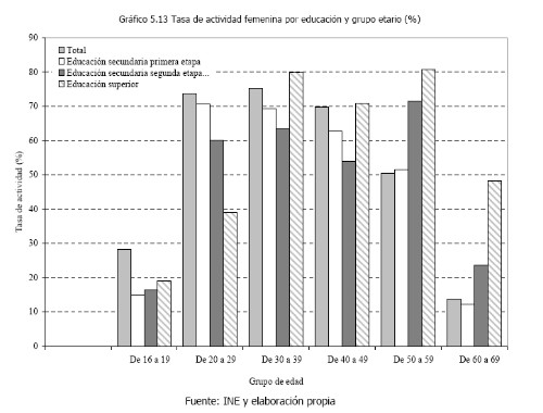 No obstante, advierte la consultora, “al no ser la Encuesta de Población Activa una encuesta longitudinal, no se puede afirmar en sentido estricto que la caída de la tasa de actividad de estos colectivos de los 30-40 a los 50 años sea el resultado de mujeres que abandonan temporalmente la actividad para reincorporarse a ésta transcurrido el período de crianza de los hijos, y no el fruto de la combinación de abandonos permanentes e incorporaciones tardías, pero parece razonable pensar que el primer comportamiento prima sobre el segundo”.