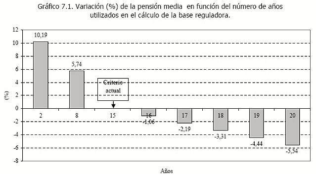 Si se analizan los datos de la Seguridad Social se comprueba que ampliar el periodo de cálculo provoca de forma progresiva una reducción de la pensión media, al entrar en liza años en los que el salario medio es menor. De media, por cada año que se amplía el período de cotización la cuantía de la pensión bajaría aproximadamente en un 1%.