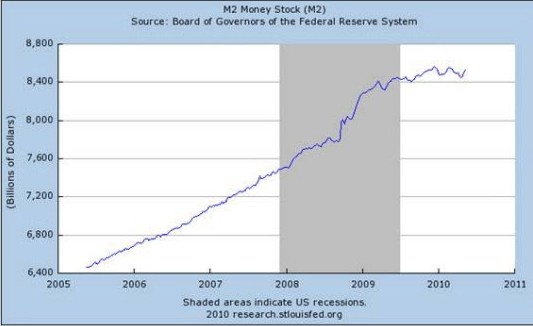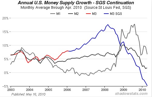 El prestigioso inversor John Mauldin dedica, precisamente, a esta cuestión su último informe para clientes, y coincide en el diagnóstico: “El crecimiento de la oferta monetaria se está desacelerando”, tal y como muestra la evolución reciente de la M2 (de los que sí existen datos oficiales). La razón, tal y como advierte Mauldin, se debe sobre todo a la persistente contracción crediticia (credit crunch) que vive EEUU desde el estallido de la crisis financiera, y que se está acelerando en los últimos meses.