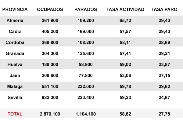 Almería, Cádiz y Málaga fueron las provincias con mayor tasa de desempleo en el segundo trimestre, con un 29,43 por ciento, las dos primeras, y un 29,62 por ciento, la última. En el resto de provincias, la tasa de paro en Granada ascendió a (29,21 por ciento), Córdoba (28,69 por ciento), Jaén (27,15 por ciento), Sevilla (24,67 por ciento) y Huelva, con una tasa de paro de 23,87 por ciento.