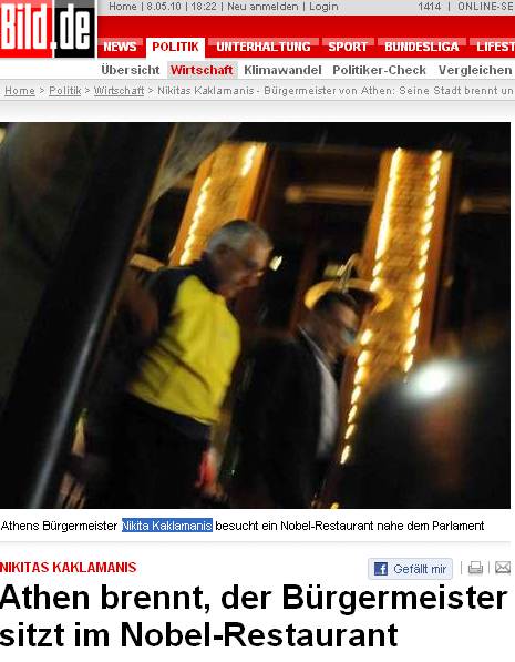 Aprovechando que el resto de la prensa internacional captaba imágenes del caos, los periodistas siguieron a Nikitas Kaklamanis, y le descubrieron en el restaurante Britainion de la calle Millioni, disfrutando de una cena con otros tres hombres.