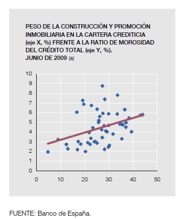 El informe señala que "el incremento de la morosidad viene determinado en buena parte por la exposición a los sectores de actividad que tradicionalmente se han mostrado más arriesgados". Es el caso de la construcción y la promoción inmobiliaria, "que presenta un perfil cíclico muy acusado", es decir, que crece más que el PIB en etapas de bonanza y cae más en épocas de vacas flacas, como la actual.