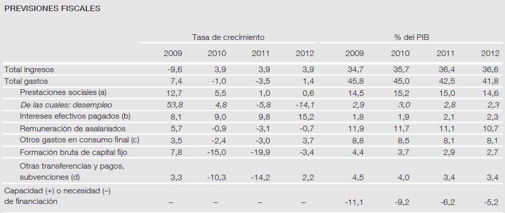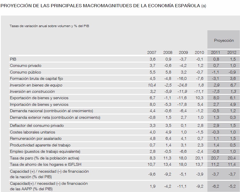 El cuadro macroeconómico contenido en los PGE de 2011, elaborado por el Ministerio de Economía, prevé un crecimiento del PIB del 1,3%, una inflación del 1%, una tasa media de paro del 19,3% y un déficit público del 6% del PIB para el conjunto de las Administraciones Públicas. Los siguientes cuadros (pinchar en la imagen) resumen las previsiones oficiales del Gobierno: