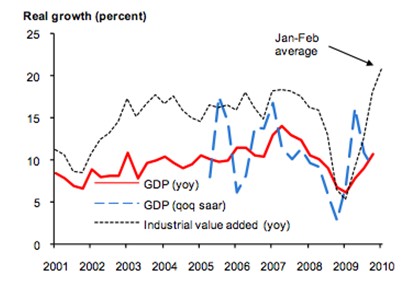 El Banco Mundial apuntó que el crecimiento de China será del 9,5 por ciento en 2010 y llamó a una política monetaria más restrictiva y a un tipo de cambio más fuerte.
