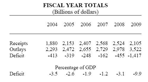 El déficit fiscal de septiembre fue de 46.000 millones de dólares, con lo que EEUU cerró el período fiscal 2009 con un saldo negativo de 1,42 billones de dólares, triplicando así el déficit de 2008 (454.800 millones de dólares), lo que supone casi el 10% del PIB, frente al 3,1% del ejercicio anterior, según el CBO.