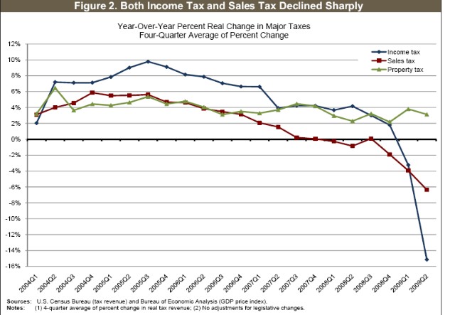 Un total de 49 estados han ingresado menos dinero durante este trimestre y 36 muestran un declive de dos dígitos. A junio de 2009, el conjunto de estados han recaudado 63.000 millones de dólares menos, el doble de lo que habían obtenido de los estímulos fiscales aplicado por el Gobierno federal de Barack Obama.
