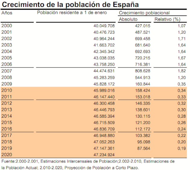 España mantendría una tasa anual de crecimiento demográfico en los próximos años con niveles inferiores al 0,35% y en ligera tendencia decreciente. De esta forma, y después de unos años de elevado crecimiento demográfico, España alcanzaría poco más de 47 millones de habitantes en el año 2020, en caso de que se cumplan las previsiones del INE.