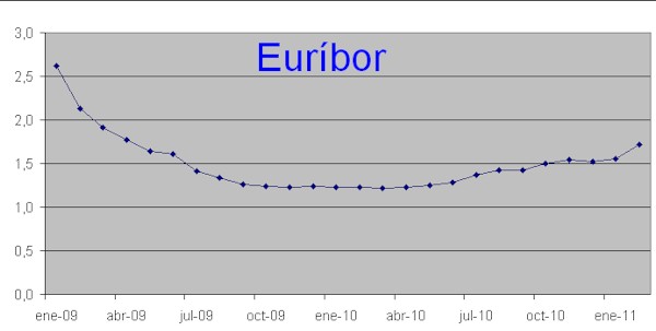 2. Euríbor al alza: Tampoco los tipos de interés se lo pondrán fácil a los (pocos) nuevos compradores que se acerquen a su banco a preguntar por las condiciones. Tras un par de años de bajadas, el Euríbor terminó 2010 y comenzó 2011 con continuas subidas (alcanzó el 1,714% en febrero, medio punto más que un año antes). Aunque aún sigue siendo bajo en términos históricos, la tendencia es al alza. El BCE ya no puede bajar más los tipos y ante una escalada de la inflación, con un crecimiento más o menos consolidado en el conjunto de la eurozona, podría sentir la tentación de encarecer algo el precio del dinero.