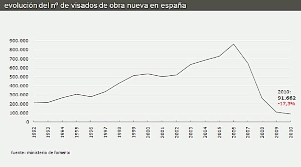 En 2010 se batió el récord de menos visados para obras nuevas aprobados. Hasta que el mercado no reabsorba los pisos sin vender, no se comenzarán a construir los nuevos. Al menos por este lado, no habrá más casas vacías que añadir a las que, por miles, aparecen diseminadas por toda la superficie del país.