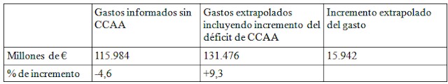En la página 12 de este mismo informe del IGAE podemos ver cómo dos grandes partidas de gasto aumentan, como son los gastos de personal (+2,3%) y financieros (+10,1%), mientras disminuyen las inversiones (-7,9%) y los gastos corrientes (-3,4%). Sumando estas cuatro partidas todavía vemos un aumento de 1.326 millones (+1,1%).