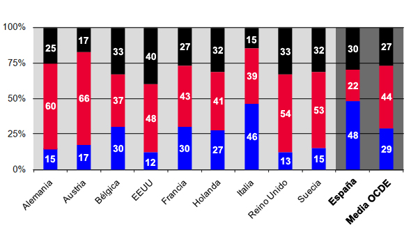 Quizás el dato más sorprendente de los tres sea ese 22% de lo que podría denominarse como profesionales de nivel medio. Es un porcentaje bajísimo comparado con casi cualquier otro país rico. Hay economías con más licenciados y otras con más fracaso escolar, pero en prácticamente todas existe al menos un 40-45% de personas con una titulación secundaria superior y que decidieron no acudir a la universidad: lo que se conoce como técnicos.