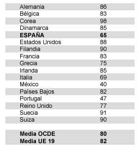 En el último informe de la OCDE Panorama de la Educación 2010 se distribuye a los habitantes de los países miembros de la organización según su nivel de estudios. España tiene, para todos sus habitantes de entre 25 y 64 años, un 30% de universitarios (por encima de la media), pero también un 44% de personas que se han quedado en primaria o secundaria inferior y sólo un 22% que alcanzó el título de secundaria superior (bachiller o su equivalente en FP).