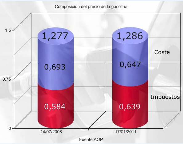 En cuanto a la presión fiscal, el sistemático aumento de los impuestos sobre los hidrocarburos, cuya demanda es poco sensible a las variaciones de precio debido a su importancia capital en toda economía, ha tenido una importante repercusión en el coste de los carburantes. Tanto es así que, tal y como revela la AOP (Asociación Española de Operadores de Productos Petrolíferos), desde 2008 los impuestos han encarecido el litro de gasolina en 5,5 céntimos y el del gasóleo en 3,6.