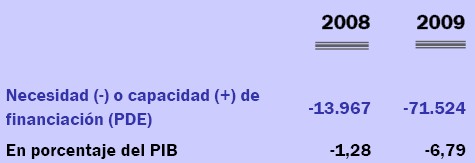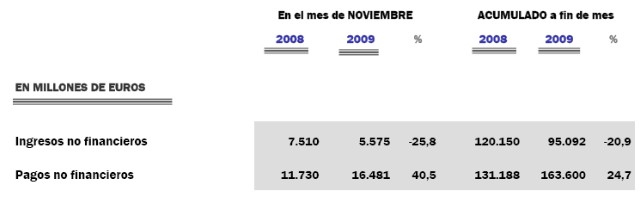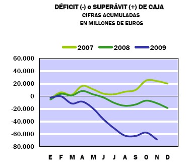 El Estado acumuló un déficit de 71.524 millones de euros hasta finales de noviembre (el 6,8% del PIB), casi cinco veces más que en el mismo período de 2008 (13.967 millones). Esto significa que el Gobierno gasta un 75% más de lo que ingresa por vía fiscal, un balance que a todas luces sería insostenible en cualquier empresa privada.