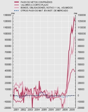 La necesidad de financiar este creciente déficit ha obligado al Tesoro a emitir un volumen récord de deuda en 2009. En concreto, el organismo financiero del Estado acaba de cerrar el pasado ejercicio con unas emisiones de 110.351 millones en letras y otros 109.431 millones en bonos y obligaciones. En total, 219.782 millones de euros, una cifra similar a la que será necesaria en 2010, según los Presupuestos Generales del Estado.
