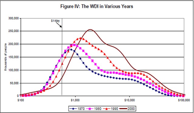 El número de personas que vivían con menos de un dólar al día (corregido de inflación) se ha reducido desde el 20% de la población mundial en 1970, al 5% en 2000, y como se ve en el siguiente gráfico (procedente de este artículo de Sala-i-Martin, que presenta la distribución de la renta mundial en 1970, 1980, 1990 y 2000), el crecimiento global ha sido muy equilibrado en términos de igualdad.