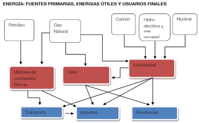 Aunque la energía es un concepto unívoco, bien definido, y sometido a una ley de conservación, las fuentes de energía que mueven la sociedad industrial son heterogéneas. En el siguiente cuadro se presentan (en blanco) las fuentes de energía primarias, es decir, los recursos que existen en la naturaleza y que se pueden convertir en energía útil, en segundo lugar (en rojo) los productos energéticos secundarios (que se pueden utilizar directamente en el proceso económico) y (en azul) los sectores que demandan la energía.