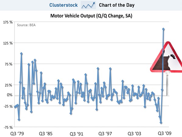 El consumo interno representa el mayor componente del PIB de EEUU, y ha sido el principal responsable del aumento del PIB en el tercer trimestre. En concreto, tan sólo este indicador representa 2,4 puntos porcentuales sobre el total del 3,5% de avance. Pues bien, más del 60% del alza del consumo responde al plan de estímulo público para fomentar la compra de coches (cash for clunkers) -subvenciones superiores a los 4.000 dólares por vehículo-.