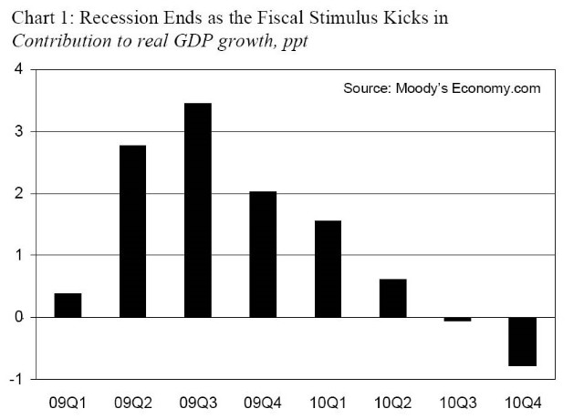 Por último, según un estudio elaborado por el profesor Mark Zandi, economista jefe y confundador de Moody´s Economy.com, este crecimiento se explica básicamente por la intervención del Gobierno. El informe, que publica Libertad Digital, bajo el título The Impact of the Recovery Act on Economic Growth (El impacto del plan de recuperación económica sobre el crecimiento), muestra claramente que los efectos del plan de estímulo irán decreciendo a medida que avanza 2010, de modo que el PIB podría volver a registrar a tasas negativas a partir de mediados del próximo año, tal y como muestra el siguiente gráfico.