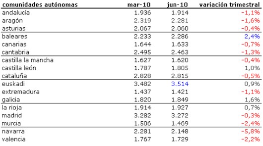 En lo que hace referencia al segundo trimestre de 2010, el precio de la vivienda usada en España ha registrado una bajada del 0,5%, lo que ha dejado el precio del metro cuadrado en 2.374 euros.
