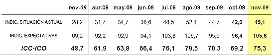 No obstante, el ICO asegura que "han mejorado sus perspectivas de ahorro y de consumo de bienes duraderos". En comparación con noviembre de 2008 el patrón es el mismo aunque con más intensidad: mayores expectativas de inflación y de subida de tipos de interés, así como mejores perspectivas de ahorro y de consumo de bienes duraderos.