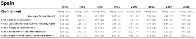 En el último de estos estudios publicados, el del Instituto Fraser de Canada, España se inició en 1980 con una nota media de 6,19. A lo largo de las dos siguientes décadas, su situación fue mejorando, hasta llegar a un máximo de 7,50 en 2004. Pues bien, desde entonces, coincidiendo con la llegada al poder de José Luis Rodríguez Zapatero, esta nota ha seguido una tendencia descendente, hasta llegar al 7,19 de 2008, último año del que se tienen datos completos. De esta manera, la clasificación muestra a España en el puesto 38 del mundo, por detrás de la gran mayoría de los países de la UE.