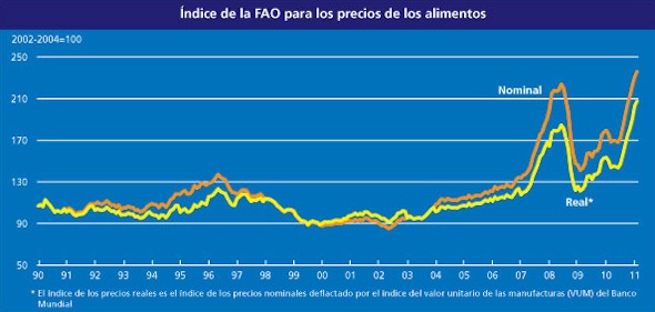 El índice de precios de los alimentos de la Organización de Naciones Unidas para la Agricultura y la Alimentación (FAO) batió el récord de los últimos 20 años en febrero de 2011 al situarse en una media de 236 puntos, un máximo histórico ya sea en términos reales como nominales.