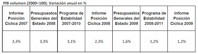 Primero, Economía revisó su previsión de crecimiento hasta el 3,1% del PIB en el Programa de Estabilidad y Crecimiento 2007-2010; posteriormente, la redujo hasta el 2,3% en el Informe de Posición Cíclica 2008; poco después, situó el avance del PIB en el 1,6%, según el escenario que acompañó a los Presupuestos Generales del Estado (PGE) para 2009; y, finalmente, lo redujo hasta el 1,2%, según el Programa de Estabilidad 2008-2011 publicado a finales de 2008.