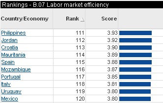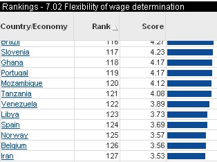 Flexibilidad para determinar sueldos: puesto 124; por detrás de Libia, Venezuela, Tanzania, Mozambique y Portugal; y por delante de Noruega, Bélgica, Irán e Irlanda.