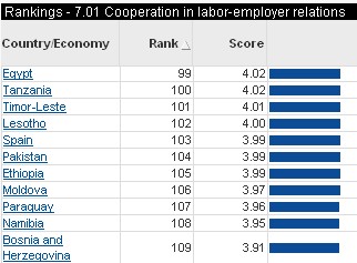 Cooperación en las relaciones empresario/empleado: puesto 103; justo por detrás de potencias de la talla de Lesotho, Timor Oriental, Tanzania y Egipto; y por delante de Pakistán, Etiopía, Moldavia y Paraguay.