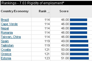 Rigidez laboral: puesto 119; por debajo de Taiwan (China), Rumanía, Nepal, Cabo Verde; y por delante de Tayikistán, Croacia, Grecia y Estonia.