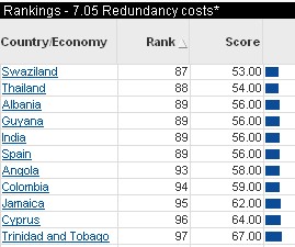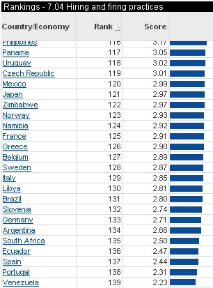 Contratación y despido: puesto 137; por detrás de Ecuador, Sudáfrica y Argentina; y tan sólo por delante de Portugal y Venezuela.