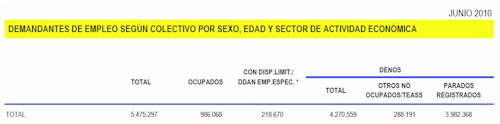 Datos que contrastan, sin embargo, con el tradicional mensaje oficial del Ministerio de Trabajo. En su nota de prensa, el departamento que dirige Celestino Corbacho se limita a indicar que el número de parados registrados en las oficinas de los servicios públicos de empleo (antiguo Inem) se redujo en 83.834 personas (gracias al inicio de la campaña estival), un 2,06% respecto a mayo, con lo que el volumen total de desempleados se situó en 3.982.368 personas, bajando de los cuatro millones por primera vez desde diciembre de 2009.