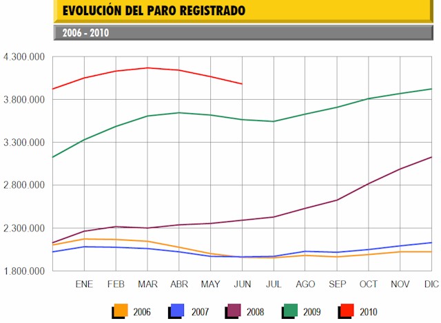 En resumen, el informe laboral de junio muestra un leve descenso del paro (apenas 10.000 personas respecto a mayo); España sigue destruyendo empleo a nivel interanual (417.479 parados más respecto a junio de 2009); mientras que la ocultación de parados aumenta en 30.000 personas respecto a mayo como resultado de la puesta en marcha del PER para desempleados sin prestación.