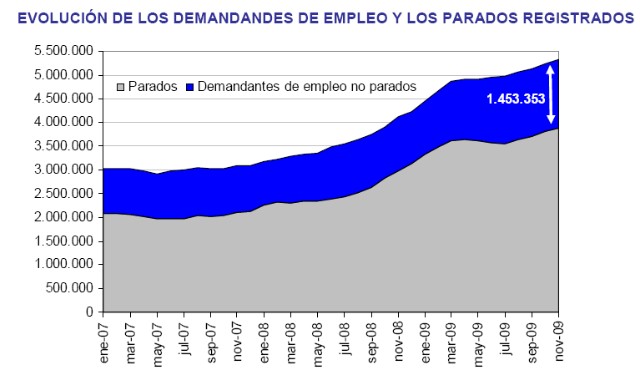 Por otro lado, el número total de demandantes de empleo aumenta hasta los 5.322.299. Esto implica que la diferencia entre demandantes y desempleados ascienda hasta los 1.453.353, el volumen más elevado de toda la serie. El crecimiento interanual de los demandantes de empleo que no se consideran parados es del 28,2%, es decir, existen más de 320.000 personas más en esta situación que hace un año.