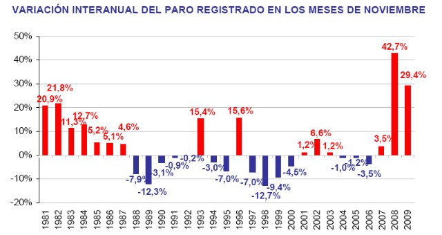 El paro ha aumentado un 29,4% en tasa interanual, el segundo mayor incremento desde hace 30 años en un mes de noviembre (879.677 personas). Es el trigésimo mes en el que el desempleo se incrementa interanualmente de manera consecutiva.
